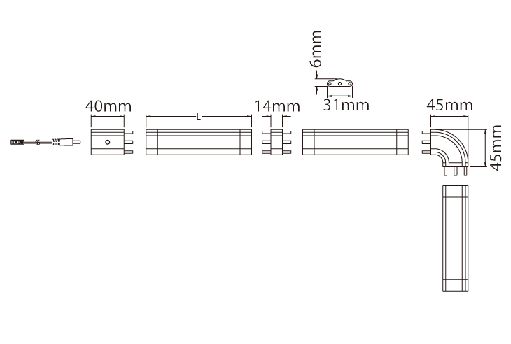 配置(Configuration):燈具兩端為DC母端口,可選配觸摸開(kāi)關(guān)、按鈕開(kāi)關(guān)、手掃開(kāi)關(guān)及直連接與直角連接的配件。